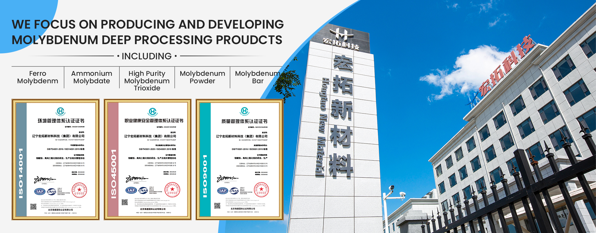 Liaoning Hongtuo New Material Technology Co.,Ltd. a subsidiary of Liaoning Chuangshi Molybdenum Industry (Group) Co., Ltd., it was registered on May 15, 2019. The factory is located at No.52 Zhongxin Road, Taihe District, Jinzhou City, Liaoning Province, China. Factory covers an area of 66,700 square meters, the first phase of construction area is 28,500 square meters. Mainly engaged in the production of molybdenum products, such as industrial molybdenum oxide, high soluble molybdenum trioxide, and ferro-molybdenum and deep processing of molybdenum products, including ammonium dimolybdate ADM, ammounium tetramolybdate AQM, pure molybdenum trioxide, molybdenum powder and other molybdenum metal materials, as well as the production and sales of required raw and auxiliary materials.